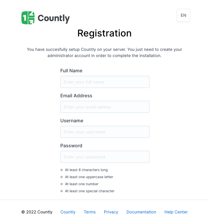 When you first access Countly, you’re presented with a form to register an administrator user for your instance. Keep track of the login information you create here, as this user has administrative control within the Countly instance.